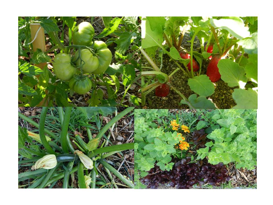 | Tomates, rabanitos, calabacin, lechugas rojas entre aromáticas |