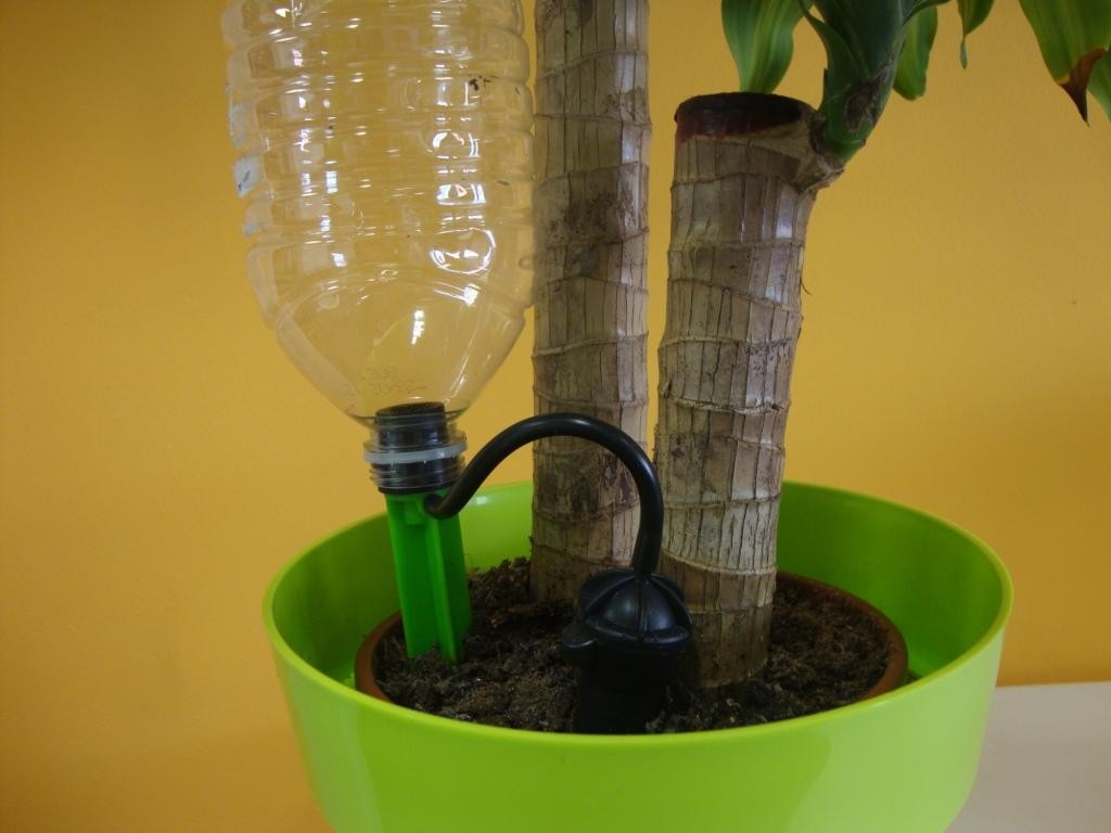 Quizás sea el sistema más sencillo y fácil de instalar. Se clava el cono en la tierra y se enrosca una botella de la capacidad de litros que creamos suficiente para regar la planta. Gracias a las diferentes roscas que tiene se puede adaptar a la gran mayoría de botellas de plástico del mercado.