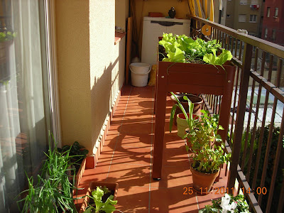 En la primavera cultivé tomates, pimientos, lechugas y cebollas. También planté fresas pero sólo me dieron 5 “mini” fresones. Ahora he “ampliado” la zona de cultivo añadiendo un par de jardineras y dos macetas.