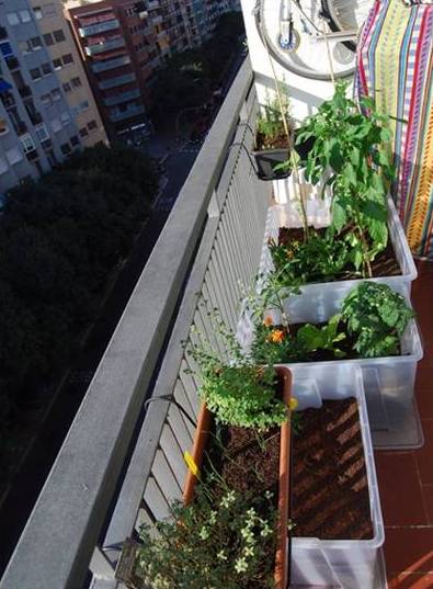 Optamos diferentes tipos de maceteros: cajas de plástico grandes de varios tamaños, para que nos permitan tener más juego para su disposición según vayamos plantando cosas, y reciclamos maceteros decorativos para las aromáticas. Este sistema nos permite cultivar sobre 2 niveles para aprovechar mejor el espacio, y estoy pensando en cultivar verticalmente en una de las paredes.