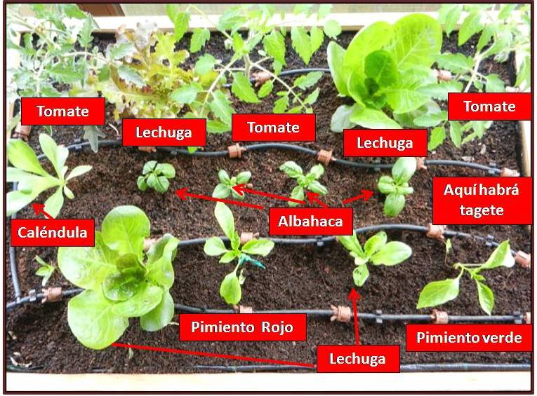 Termino este post con una foto que me encanta, que es un ejemplo de convivencia satisfactoria entre hortalizas, aromáticas y plantas ornamentales. Convivencia satisfactoria para las plantas y para nosotros que las disfrutamos. Podeis ver en la foto albahaca en el centro, con una caléndula al lado, y rodeadas de dos lechugas de distinta variedad, y las tomateras.