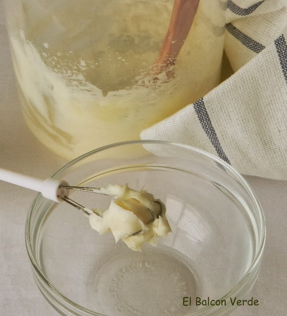 Cuando la mezcla tiene la textura de la foto, entonces es el momento adecuado para comenzar a batir. ¿Y con que se bate? Muy sencillo con la batidora y el accesorio de batir (como el de la foto). Vereis que el batidor es muy pequeño, es porque nosotros utilizamos una batidora de pilas que la tenemos únicamente para hacer cremas, no utilizamos la de la cocina. Además estas batidoras de pilas son más lentas y para hacer cremas para la piel resultan mejor que las batidoras tan rápidas que hay ahora.