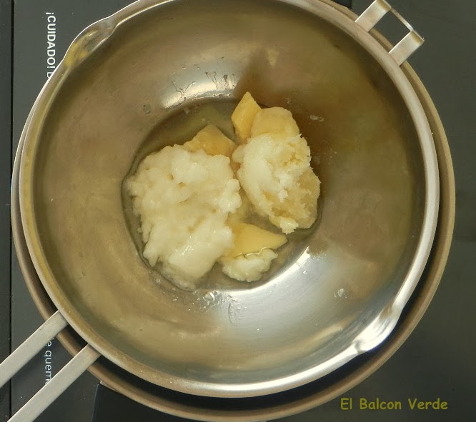 Poner todos los ingredientes a calentar al baño maria. Excepto la vitamina E. Simplemente se tienen que disolver los ingredientes, es mejor que la mezcla no alcance altas temperaturas para no perder las propiedades de los aceites y mantecas.