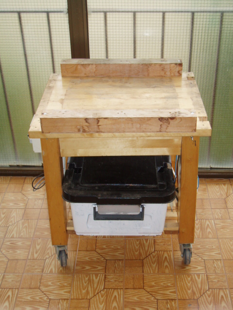 Además queriamos instalar un sistema de riego por goteo, y como nuestro balcón es pequeño queriamos colocar el depósito del agua en algún sitio que no nos quitara mucho espacio. Así que hemos adaptado una camarera de cocina de madera, a la que Javi le ha quitado una balda intermedia, y hemos colocado el cajón de cultivo encima de la camarera, y debajo hemos colocado el contenedor para el agua del riego, con su correspondiente bomba para el bombeo del agua, y un programador de riego acoplado a la mesa de cultivo.