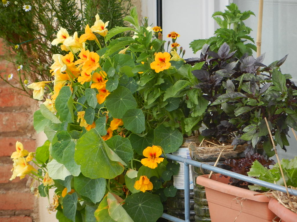 | De abajo a arriba, lehugas, albahaca sagrada, estevia, capuchina, shiso, tagete, romero
