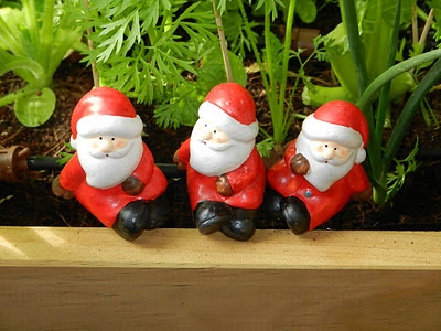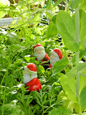 Tenía tres papa noels bajando por los tirabeques, como intrepidos escaladores se deslizaban por las ramas, me he quedado tan sorprendida que me he quedado callada esperando a ver que hacian, y ellos han seguido bajando hasta llegar a los canónigos